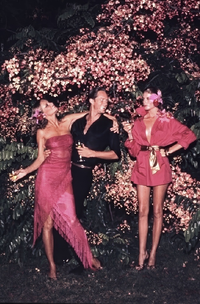 Halston with Shelley Hack, Cheryl Tiegs, Chris Royer, Karen Bjornson, Anne Holbrook, Shelley Smith by Bill King (1977)